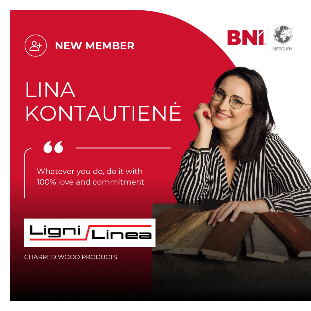 The BNI Mercury community connects those who believe in cooperation, growth, and positivity. We are delighted to welcome Lina Kontautienė, representing the Ligni Linea brand, as a new member. Her nearly decade-long career in wood processing is based on professionalism, respect for people, and a love of nature. We believe that Lina’s experience, international perspective, […]